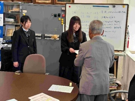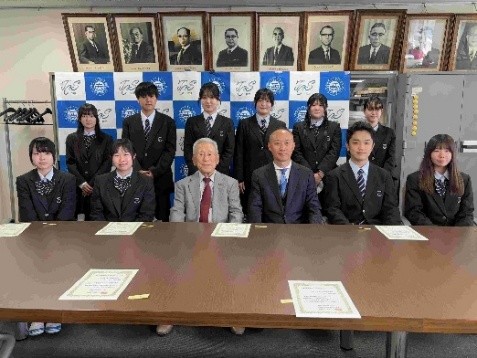 奨励奨学金の給付対象となった生徒に対し、杉本理事長から第三商業高校の校長室で一人一人に決定通知書を手渡しました(集合写真の杉本理事長の右隣が智片校長先生です)。